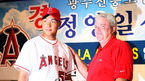 광주 진흥고 우완 투수 정영일이 9일 오후 광주 마스터스 호텔에서 미국 메이져리그 로스앤젤레스 에인절스 오브 애너하임 입단 조인식을 가졌다. 에인절스의 에디 베인 스카우트 팀장이 정영일에게 유니폼을 입혀준 뒤 기념 촬영하고 있다./광주=박영태 기자 ds3fan@osen.co.kr [Copyright ⓒ 한국 최고의 스포츠 엔터테인먼트 전문 미디어...