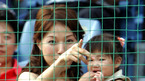 22일 잠실야구장에서 '2006 삼성 PAVV 프로야구 올스타전'이 성대하게 열렸다. 홍성흔의 아내 김정임씨가 딸과 함께 경기장을 찾아 보채는 딸에게 아빠 홍성흔을 가리키며 달래고 있다./ 잠실=손용호 기자 spjj@osen.co.kr [Copyright ⓒ 한국 최고의 스포츠 엔터테인먼트 전문 미디어...