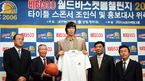 비타500 WBC 2006 타이틀 스폰서 조인식 및 하승진 WBC 홍보대사 위촉식이 서울 삼성동 코엑스 인터컨티넨탈 호텔 젤코바룸에서 열렸다. 최수부 광동제약 대표이사 회장이 홍보대사 하승진에게 T셔츠를 선물하며 가장 큰 사이즈로 제작했는데도 작아 보인다며 선물하자 하승진이 웃으며 들어올리고 있다. /주지영 기자 jj0jj0@osen.co.kr...