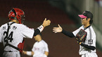 3일 잠실야구장에서 열린 LG 트윈스와 현대 유니콘스 경기 9회말 7-4 리드 상황에서 구원 등판, 세이브를 올린 LG 우규민이 최승환 포수와 승리의 악수를 나누고 있다./잠실=김영민 기자ajyoung@osen.co.kr [Copyright ⓒ 한국 최고의 스포츠 엔터테인먼트 전문 미디어 OSEN(www.osen.co.kr) 무단전재 및 재배포 금지]
