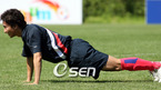 아시안컵 예선 대만전 엔트리 선발을 위해 지난 6일 파주 NFC에 소집된 베어벡호 1기 선수들이 사흘째인 8일 오전 뜨거운 햇살 아래 훈련을 소화했다. 미니게임 중 안정환이 벌칙으로 푸시업을 하고 있다./파주=박영태 기자 ds3fan@osen.co.kr [Copyright ⓒ 한국 최고의 스포츠 엔터테인먼트 전문 미디어...