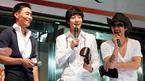 오는 9월 16일 장충체육관에서 벌어지는 K-1 파이팅 네트워크 KHAN 2006 in seoul 대회서 이종격투기 데뷔전을 치를 전 프로복싱 WBA 세계챔피언 최용수가 11일 저녁 서울 동대문 두산타워 야외 무대에서 출정식을 가졌다. 팬이 무대로 나와 펀치를 날리는 모습을 임치빈과 최용수(왼쪽부터)가 지켜보며 미소 짓고 있다./주지영 기자...