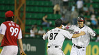 12일 서울 상암월드컵구장에서 벌어진 '2006 하나은행 FA컵 전국 축구선수권대회' FC 서울과 수원 삼성의 8강전서 치열한 접전 끝에 수원이 승부차기로 서울에 승리했다. 승리의 주역이 된 수원의 골키퍼 박호진을 이싸빅이 달려가 축하해 주고 있다./상암=손용호 기자spjj@osen.co.kr [Copyright ⓒ 한국 최고의 스포츠...