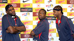 '비타 500 월드 바스켓볼 챌린지 2006' 에 출전하는 미국 대표팀의 기자회견이 12일 오전 서울 코엑스 인터콘티넨탈 호텔에서 열렸다. 포토타임 때 드웨인 웨이드(가운데)와 르브론 제임스(왼쪽)가 코믹한 포즈를 취하자 카멜로 앤서니가 웃고 있다./손용호 기자spjj@osen.co.kr [Copyright ⓒ 한국 최고의 스포츠...