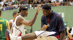 13일 잠실체육관에서 벌어진 '비타 500 월드바스켓볼챌린지 2006' 미국-리투아니아전 3쿼터서 미국의 카멜로 앤서니(왼쪽)가 득점에 성공한 뒤 작전 타임에 벤치로 들어오며 르브론 제임스와 특이한 세리머니를 연출하고 있다./잠실체=손용호 기자spjj@osen.co.kr [Copyright ⓒ 한국 최고의 스포츠 엔터테인먼트 전문...