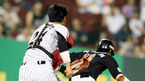 17일 잠실 야구장에서 열린 2006 프로야구 LG 트윈스와 롯데 자이언츠의 경기 롯데의 4회초 1사 1,3루 황성용 타석 때 3루주자 박기혁이 더블 스틸을 노리다 런다운에 걸려 LG 포수 최승환에게 태그아웃되고 있다./잠실=박영태 기자 ds3fan@osen.co.kr [Copyright ⓒ 한국 최고의 스포츠 엔터테인먼트 전문 미디어...