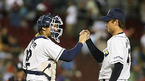 19일 잠실 야구장에서 열린 두산 베어스와 삼성 라이온즈의 경기 9회말 마무리로 등판해 3-2 승리를 지키며 28세이브째를 기록한 두산의 정재훈이 경기 후 포수 홍성흔과 승리의 하이파이브를 나누고 있다./잠실=김영민 기자ajyoung@osen.co.kr [Copyright ⓒ 한국 최고의 스포츠 엔터테인먼트 전문 미디어...