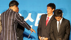2006 삼성 하우젠 K-리그 올스타전 전야제가 19일 저녁 인천 송도 라마다 호텔에서 열렸다. 백지훈이 자신의 기념패를 들지 않으려는 송종국에게 되건네주자 송종국이 딴청을 부리고 있다./인천=손용호 기자spjj@osen.co.kr [Copyright ⓒ 한국 최고의 스포츠 엔터테인먼트 전문 미디어 OSEN(www.osen.co.kr) 무단전재 및...