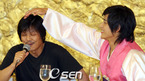영화 '날라리 종부뎐'의 촬영현장 공개 행사가 22일 서울 삼성동의 라마다 서울 호텔에서 열렸다. 촬영현장 공개후 가진 기자 간담회에서 박진우가 극중 장인으로 나오는 조상구의 머리를 가지런히 해주고 있다./박영태 기자 ds3fan@osen.co.kr [Copyright ⓒ 한국 최고의 스포츠 엔터테인먼트 전문 미디어...