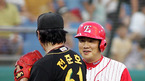프로야구 첫 개인 통산 200승에 단 1승을 남겨두고 3차례 쓴맛을 본 송진우가 22일 대전 구장에서 400승 4수에 나섰다. 2회말 2사 만루서 현대의 선발 투수 전준호가 한화 김민재를 삼진으로 잡고 이닝을 마감하자 3루 주자였던 동기생 이도형이 덕아웃으로 돌아가며 얘기를 건네고 있다./대전=손용호 기자spjj@osen.co.kr...