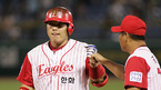 프로야구 첫 개인 통산 200승에 단 1승을 남겨두고 3차례 쓴맛을 본 송진우가 22일 대전 구장에서 200승 4수째에 나섰다. 0-0이던 한화의 5회말 1사 만루서 김태균이 선제 2타점 적시타를 치고 나가 김호 1루코치와 하이파이브를 하고 있다./대전=손용호 기자spjj@osen.co.kr [Copyright ⓒ 한국 최고의 스포츠 엔터테인먼트...