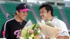 27일 잠실 야구장에서 벌어진 두산 베어스와 LG 트윈스의 경기에 앞서 두산 김동주의 프로 통산 47번째 1000안타에 대한 시상이 있었다. 동기생인 LG 주장 조인성이 김동주에게 꽃다발을 전달하고 있다./ 잠실=손용호 기자spjj@osen.co.kr [Copyright ⓒ 한국 최고의 스포츠 엔터테인먼트 전문 미디어...