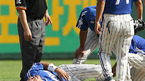 3일 잠실야구장에서 열린 LG 트윈스와 삼성 라이온즈의 경기 삼성의 6회초 무사 1루서 박진만이 삼진 아웃되는 순간 1루 주자 김한수가 2루 도루를 시도하다 아웃되면서 왼쪽 발목을 접질린 뒤 김현욱 코치에게 업혀 나가고 있다./잠실=김영민 기자ajyoung@osen.co.kr [Copyright ⓒ 한국 최고의 스포츠 엔터테인먼트 전문 미디어...