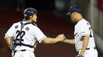 5일 잠실야구장에서 열린 2006 프로야구 두산 베어스와 LG 트윈스의 경기에서 시즌 첫 세이브를 기록한 박명환이 포수 홍성흔과 하이파이브 하고 있다./잠실=박영태 기자 ds3fan@osen.co.kr [Copyright ⓒ 한국 최고의 스포츠 엔터테인먼트 전문 미디어 OSEN(www.osen.co.kr) 무단전재 및 재배포 금지]