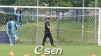 대만과의 아시안컵 예선을 하루 앞둔 5일 태극전사들은 오전 훈련 후 오후에는 '축구 골프' 게임으로 훈련을 대신했다. 필드 플레이어들이 2차례 라운드를 가진 반면 1라운드에 빠진 골키퍼 이운재가 김영광과 함께 골문에 묶은 고무줄을 허리에 차고 점프 훈련을 하고 있다./파주=손용호 기자spjj@osen.co.kr [Copyright...