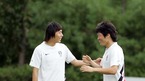 대만과의 아시안컵 예선을 하루 앞둔 5일 태극전사들은 오전 훈련 후 오후에는 '축구 골프' 게임으로 훈련을 대신했다. 축구공으로 돌아가며 9개의 깃대를 맞히는 게임으로 축구장 3개면을 이용, 진행됐다. 백지훈과 한 조를 이룬 박지성이 한 번에 깃대를 맞혀 '홀인원'을 기록한 뒤 좋아하고 있다./파주=손용호...