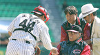 10일 잠실야구장에서 열린 LG 트윈스와 SK 와이번스 경기전 시구를 한 프로레슬러 김일씨에게 LG 포수 조인성이 시구공을 전달 하고 있다./잠실=김영민기자ajyoung@osen.co.kr [Copyright ⓒ 한국 최고의 스포츠 엔터테인먼트 전문 미디어 OSEN(www.osen.co.kr) 무단전재 및 재배포 금지]