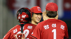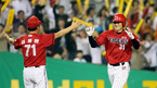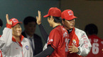 2006프로야구 4강 티켓 확보에 결정적 영향을 미칠 수 있는 두산 베어스와 KIA 타이거즈의 주말 3연전 첫 경기가 16일 잠실야구장에서 열렸다. 6-2로 이겨 4위로 복귀한 KIA의 김상훈 장성호가 경기 후 승리의 주역인 이현곤과 하이파이브 하고 있다./잠실=박영태 기자 ds3fan@osen.co.kr [Copyright ⓒ 한국 최고의...