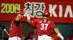 2006프로야구 4강 티켓 확보에 결정적 영향을 미칠 수 있는 두산 베어스와 KIA 타이거즈의 주말 3연전 첫 경기가 16일 잠실야구장에서 열렸다. KIA 7회초 1사 만루 4번 조경환이 중견수 희생플라이로 타점을 올린뒤 대가 타석에 있던 손지환과 하이파이브 하고 있다./잠실=박영태 기자 ds3fan@osen.co.kr [Copyright ⓒ 한국...