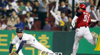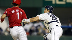 2006프로야구 4강 티켓 확보에 결정적 영향을 미칠 두산 베어스와 KIA 타이거즈의 주말 3연전 첫 경기가 16일 잠실야구장에서 열렸다. KIA 3회초 무사 만루 4번 조경환의 1루 땅볼 때 두산 1루수 최준석의 홈송구가 조경환의 헬멧에 맞고 튀기자 2루주자 이용규까지 홈인했다. 이용규가 홈에서 두산 투수 랜들과 충돌로 옷이 찢어진 채 덕아웃으로...