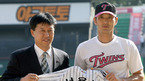 24일 잠실야구장에서 열린 2006 프로야구 LG 트윈스와 두산 베어스의 경기 5회가 끝나고 클리닝타임을 이용해 치러진 LG 서용빈 김정민의 은퇴식에서 김정민이 부인 최애란 씨의 은퇴 격려 메시지를 듣고 있다./잠실=박영태 기자 ds3fan@osen.co.kr [Copyright ⓒ 한국 최고의 스포츠 엔터테인먼트 전문 미디어...