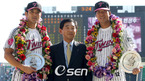 24일 잠실야구장에서 열린 2006 프로야구 LG 트윈스와 두산 베어스의 경기 5회가 끝나고 클리닝타임을 이용해 치러진 LG 서용빈 김정민의 은퇴식에서 김정민이 후배 포수 조인성으로부터 기념패를 받고 기념촬영하고 있다./잠실=박영태 기자 ds3fan@osen.co.kr [Copyright ⓒ 한국 최고의 스포츠 엔터테인먼트 전문 미디어...