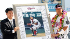 24일 잠실야구장에서 열린 2006 프로야구 LG 트윈스와 두산 베어스의 경기 5회가 끝나고 클리닝타임을 이용해 치러진 LG 서용빈 김정민의 은퇴식에서 서용빈이 김연중 단장으로부터 대형 사진 액자를 선물받고 기념촬영을 하고 있다./잠실=박영태 기자 ds3fan@osen.co.kr [Copyright ⓒ 한국 최고의 스포츠 엔터테인먼트 전문 미디어...