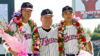 24일 잠실야구장에서 열린 2006 프로야구 LG 트윈스와 두산 베어스의 경기 5회가 끝나고 클리닝타임을 이용해 치러진 LG 서용빈 김정민의 은퇴식에서 김정민의 1년 후배이자 서용빈과 동기생인 유지현 코치가 꽃다발을 건네준 뒤 기념촬영을 하고 있다./잠실=박영태 기자 ds3fan@osen.co.kr [Copyright ⓒ 한국 최고의 스포츠...