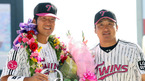 24일 잠실야구장에서 열린 2006 프로야구 LG 트윈스와 두산 베어스의 경기 5회가 끝나고 클리닝타임을 이용해 치러진 LG 서용빈 김정민의 은퇴식에서 양승호 감독대행이 두 선수에게 꽃다발을 건네고 있다./잠실=박영태 기자 ds3fan@osen.co.kr [Copyright ⓒ 한국 최고의 스포츠 엔터테인먼트 전문 미디어...