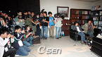 내년 초 개봉 예정인 미스터리 스릴러 영화 '천개의 혀' 제작사가 25일 오후 경기도 남양주 양수리 종합촬영소에서 촬영현장 공개행사를 가졌다. 정유석 김명민 유준상 김태우 이규만 감독(왼쪽부터)이 나란히 앉아 연기 의논을 하고 있다./주지영 기자 jj0jj0@osen.co.kr [Copyright ⓒ 한국 최고의 스포츠 엔터테인먼트...