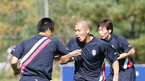 8일 가나, 11일 시리아전을 앞두고 파주 NFC에서 훈련에 돌입한 태극전사들이 6일 추석 아침 간단한 차례로 조상에 대한 예의를 갖추고 바로 강훈에 돌입했다. 설기현과 김상식이 어깨싸움을 하는 스트레칭을 하고 있다./파주=손용호 기자spjj@osen.co.kr [Copyright ⓒ 한국 최고의 스포츠 엔터테인먼트 전문 미디어...