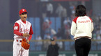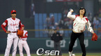 11일 대전 야구장에서 열린 2006 프로야구 준플레이오프 최종 3차전 한화 이글스와 KIA 타이거즈의 경기에 앞서 인기 개그맨 김미려가 시구를 하기 위해 선수들이 던지는 마운드로 오르자 한화 선발투수 송진우가 깜짝 놀라고 있다./대전=박영태 기자 ds3fan@osen.co.kr [Copyright ⓒ 한국 최고의 스포츠 엔터테인먼트 전문 미디어...