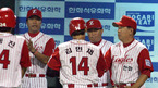 11일 대전 야구장에서 열린 2006 프로야구 준플레이오프 최종 3차전 한화 이글스와 KIA 타이거즈의 경기 3회말 선두 9번 김민재가 좌월 선제 홈런을 날리고 들어와 덕아웃의 코칭스태프와 하이파이브 하고 있다./대전=박영태 기자 ds3fan@osen.co.kr [Copyright ⓒ 한국 최고의 스포츠 엔터테인먼트 전문 미디어...