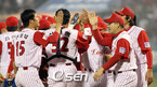 11일 대전 야구장에서 열린 2006 프로야구 준플레이오프 최종 3차전 한화 이글스와 KIA 타이거즈의 경기에서 6-4로 승리해 플레이오프에 진출한 한화 선수단이 하이파이브로 기쁨을 나누고 있다./대전=박영태 기자 ds3fan@osen.co.kr [Copyright ⓒ 한국 최고의 스포츠 엔터테인먼트 전문 미디어 OSEN(www.osen.co.kr)...