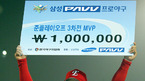 11일 대전 야구장에서 열린 2006 프로야구 준플레이오프 최종 3차전 한화 이글스와 KIA 타이거즈의 경기에서 6-4로 승리해 플레이오프에 진출한 한화의 고동진이 '준플레이오프 MVP'에 선정돼 트로피와 200만원의 상금을 받고 기뻐하고 있다./대전=박영태 기자 ds3fan@osen.co.kr [Copyright ⓒ 한국 최고의...
