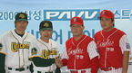한화와 현대의 플레이오프 개막을 하루 앞두고 12일 오후 한국야구위원회에서 미디어데이 행사가 열렸다. 김재박 현대 감독과 김인식 한화 감독이 선수 대표 이숭용 김태균과 함께 참석, 악수를 나누고 있다./김영민 기자ajyoung@osen.co.kr [Copyright ⓒ 한국 최고의 스포츠 엔터테인먼트 전문 미디어 OSEN(www.osen.co.kr)...