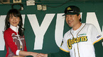 13일 수원 야구장에서 열린 2006 프로야구 플레이오프 1차전 현대 유니콘스와 한화 이글스의 경기에 앞서 시구를 맡은 탤런트 윤정희가 현대 덕아웃에 연습차 들러 김재박 감독과 악수를 나누고 있다./수원=김영민 기자ajyoung@osen.co.kr [Copyright ⓒ 한국 최고의 스포츠 엔터테인먼트 전문 미디어...