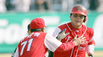 14일 수원 야구장서 벌어진 2006 프로야구 플레이오프 2차전 현대 유니콘스와 한화 이글스의 경기 1회초 2사 1루서 김태균이 우월 투런 홈런을 날리고 들어와 선발 정민철로부터 축하를 받고 있다./수원=김영민 기자ajyoung@osen.co.kr [Copyright ⓒ 한국 최고의 스포츠 엔터테인먼트 전문 미디어...