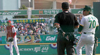 14일 수원 야구장서 벌어진 2006 프로야구 플레이오프 2차전 현대 유니콘스와 한화 이글스의 경기 3회말 선두 김동수의 타석 때 현대 김재박 감독이 문승훈 구심에게 한화 선발투수 정민철의 투구 동작에 대해 이의를 제기하고 있다./수원=김영민 기자ajyoung@osen.co.kr [Copyright ⓒ 한국 최고의 스포츠 엔터테인먼트 전문 미디어...