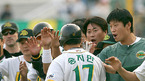 14일 수원 야구장서 벌어진 2006 프로야구 플레이오프 2차전 현대 유니콘스와 한화 이글스의 경기 7회말 2사 후 송지만이 좌중월 솔로 홈런을 날려 4-3으로 추격하자 동료들이 축하하고 있다./수원=김영민 기자ajyoung@osen.co.kr [Copyright ⓒ 한국 최고의 스포츠 엔터테인먼트 전문 미디어 OSEN(www.osen.co.kr)...