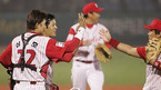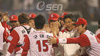 16일 대전 야구장에서 벌어진 2006 프로야구 플레이오프 3차전 한화 이글스와 현대 유니콘스의 경기서 5-4 로 이긴 한화 선수들이 기뻐하고 있다./대전=김영민 기자ajyoung@osen.co.kr [Copyright ⓒ 한국 최고의 스포츠 엔터테인먼트 전문 미디어 OSEN(www.osen.co.kr) 무단전재 및 재배포 금지]