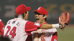 16일 2006 프로야구 플레이오프 한화 이글스와 현대 유니콘스의 3차전서 한화가 이도형의 결승 홈런과 문동환 구대성의 완벽 계투로 5-4로 신승, 한국시리즈 진출에 1승을 남겨놓았다. 구대성이 완벽한 투구로 세이브를 거둔 뒤 김태균과 하이파이브를 나누고 있다./대전=손용호 기자spjj@osen.co.kr [Copyright ⓒ 한국 최고의 스포츠...