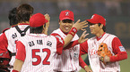 16일 대전구장에서 벌어진 2006 프로야구 플레이오프 한화 이글스와 현대 유니콘스의 3차전서 한화가 이도형의 결승 홈런과 문동환 구대성의 완벽 계투로 5-4로 신승, 한국시리즈 진출에 1승을 남겨놓았다. 세이브를 거둔 구대성이 선발 류현진을 구원, 동점을 내줬던 최영필의 축하를 받고 있다./대전=손용호 기자spjj@osen.co.kr...