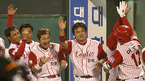 16일 대전 야구장에서 벌어진 2006 프로야구 플레이오프 3차전 한화 이글스와 현대 유니콘스의 경기 6회말 1사 후 이도형이 좌월 솔로 홈런을 날리고 들어오자 김민재(왼쪽에서 두 번째)가 힘찬 제스처로 환영하고 있다./대전=김영민 기자ajyoung@osen.co.kr [Copyright ⓒ 한국 최고의 스포츠 엔터테인먼트 전문 미디어...