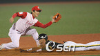 16일 대전 야구장에서 벌어진 2006 프로야구 플레이오프 3차전 한화 이글스와 현대 유니콘스의 경기 6회말 2사 1,3루서 김민재의 유격수 땅볼 때 현대 유격수 차화준의 악송구를 점프하며 잡은 1루수 이숭용이 태그아웃으로 추가 실점을 막고 있다./대전=김영민 기자ajyoung@osen.co.kr [Copyright ⓒ 한국 최고의 스포츠...
