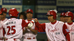 16일 대전 야구장에서 2006 프로야구 플레이오프 3차전 한화 이글스와 현대 유니콘스 경기가 열렸다. 2회초 선두타자 서튼이 우월 솔로 홈런을 날리고 동료들로부터 축하를 받고 있다./대전=김영민 기자ajyoung@osen.co.kr [Copyright ⓒ 한국 최고의 스포츠 엔터테인먼트 전문 미디어 OSEN(www.osen.co.kr) 무단전재 및...