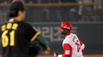 16일 2006 프로야구 플레이오프 한화 이글스와 현대 유니콘스의 3차전 경기가 대전구장에서 벌어졌다. 현대의 2회초 선두타자 서튼이 류현진을 상대로 우측 담장을 넘어가는 솔로 홈런을 날리고 홈을 밟다 발목을 접질려 괴로운 표정을 짓고 있다./대전=손용호 기자spjj@osen.co.kr [Copyright ⓒ 한국 최고의 스포츠 엔터테인먼트 전문...
