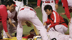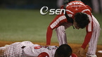 17일 대전 야구장에서 열린 2006 프로야구 플레이오프 4차전 한화 이글스와 현대 유니콘스 경기 5회말 무사 클리어가 현대 김수경의 투구에 헬멧을 맞고 쓰러져 있다./대전=김영민 기자ajyoung@osen.co.kr[Copyright ⓒ 한국 최고의 스포츠 엔터테인먼트 전문 미디어 OSEN(www.osen.co.kr) 무단전재 및 재배포 금지]