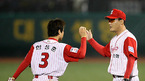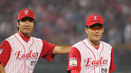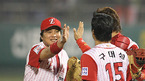 17일 대전 야구장에서 열린 2006 프로야구 플레이오프 4차전 한화 이글스와 현대 유니콘스 경기서 4-0 승리를 거두며 한국시리즈에 진출한 한화 김태균이 구대성과 하이파이브를 하고 있다./대전=김영민 기자ajyoung@osen.co.kr [Copyright ⓒ 한국 최고의 스포츠 엔터테인먼트 전문 미디어 OSEN(www.osen.co.kr)...