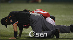 17일 대전 야구장에서 열린 2006 프로야구 플레이오프 4차전 한화 이글스와 현대 유니콘스 경기 8회초 홍원기의 파울 타구에 박기택 구심이 부상을 입고 괴로워 하고 있다./대전=김영민 기자ajyoung@osen.co.kr [Copyright ⓒ 한국 최고의 스포츠 엔터테인먼트 전문 미디어 OSEN(www.osen.co.kr) 무단전재 및 재배포...
